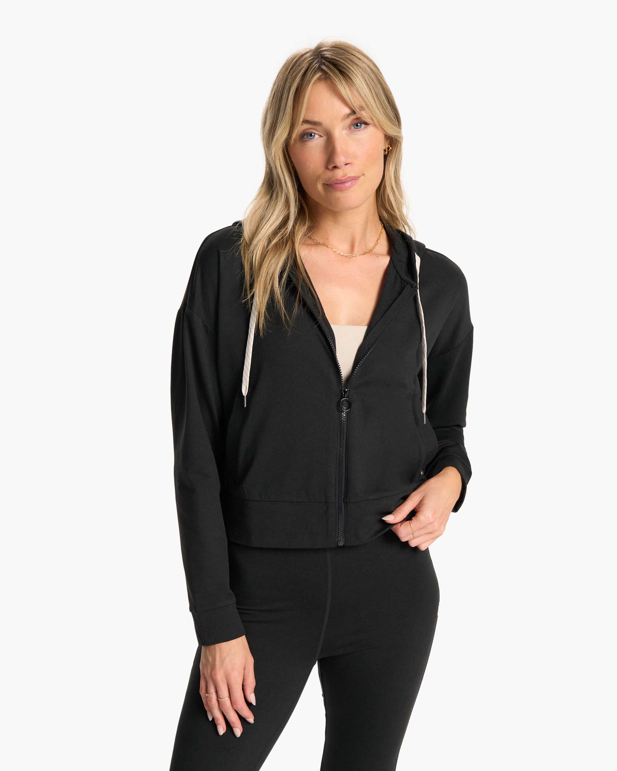 Might show up early, might stay at home. This full-zip hoodie is good either way with its soft and cozy performance stretch knit and just-right cropped length.